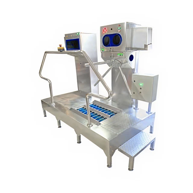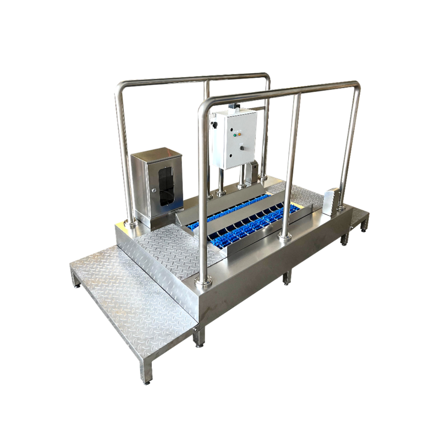 • Lave-semelles mecanique automatique avec brosses rotatives et injection de desinfectant — bien superieur au pediluve statique dont l’efficacite decroit rapidement